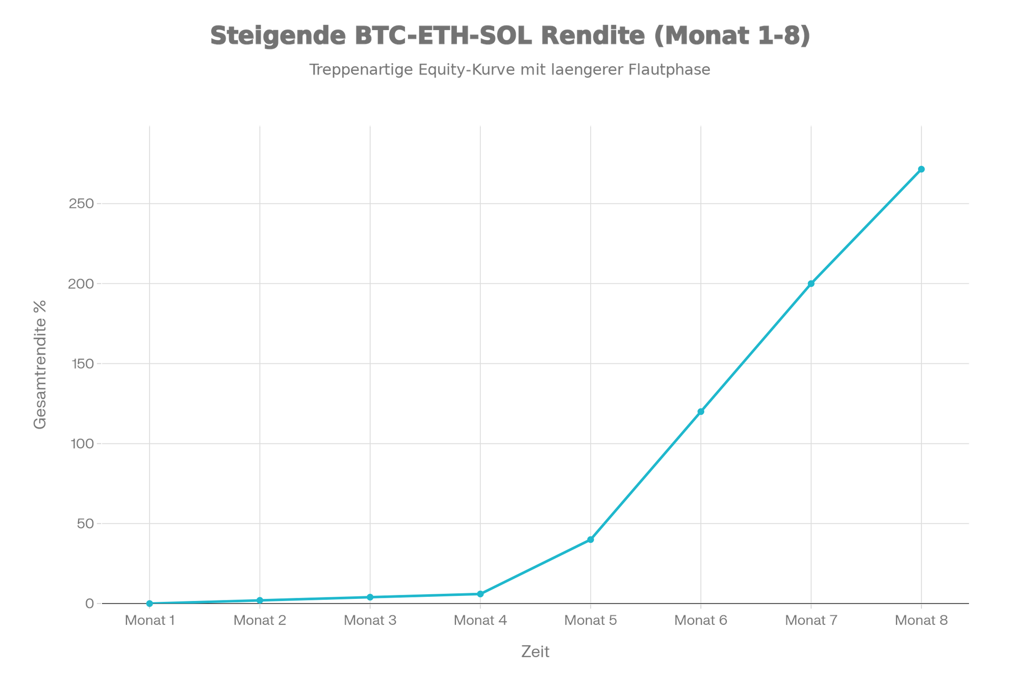Dieser Chart zeigt die Entwicklung eines vollautomatisierten Krypto‑Kontos, das ausschließlich mit den drei Leitwährungen Bitcoin, Ethereum und Solana arbeitet. Die Equity‑Kurve verläuft überwiegend steigend und illustriert, wie die Strategie Trends und Volatilität im Kryptomarkt nutzt, während Rücksetzer vergleichsweise kurz und begrenzt bleiben.